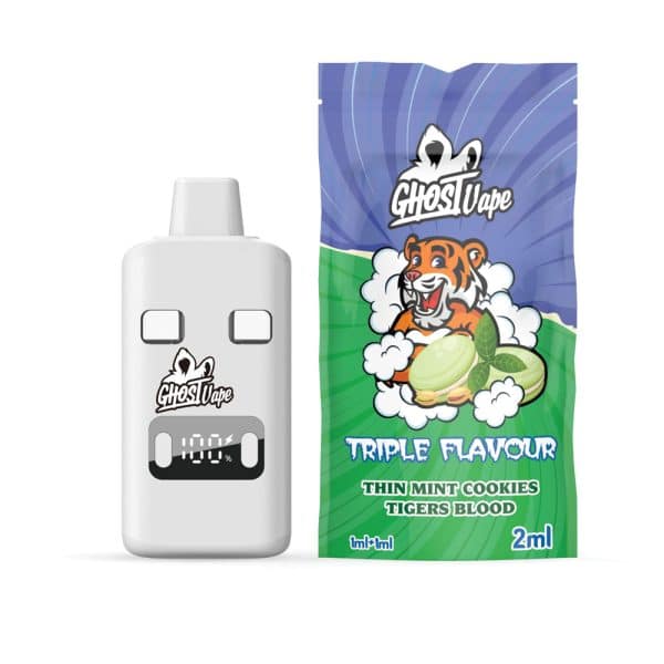 Satisfy your cravings with the bold flavors of Thin Mint Cookies and Tiger’s Blood, expertly crafted into a high-tech THC vape by Ghost Vapes. Thin Mint Cookies brings a cool, minty richness reminiscent of its dessert namesake, while Tiger’s Blood adds a fruity explosion of watermelon, strawberry, and coconut. With the ability to switch between flavors or inhale both simultaneously, this vape offers endless customization for your cannabis journey.